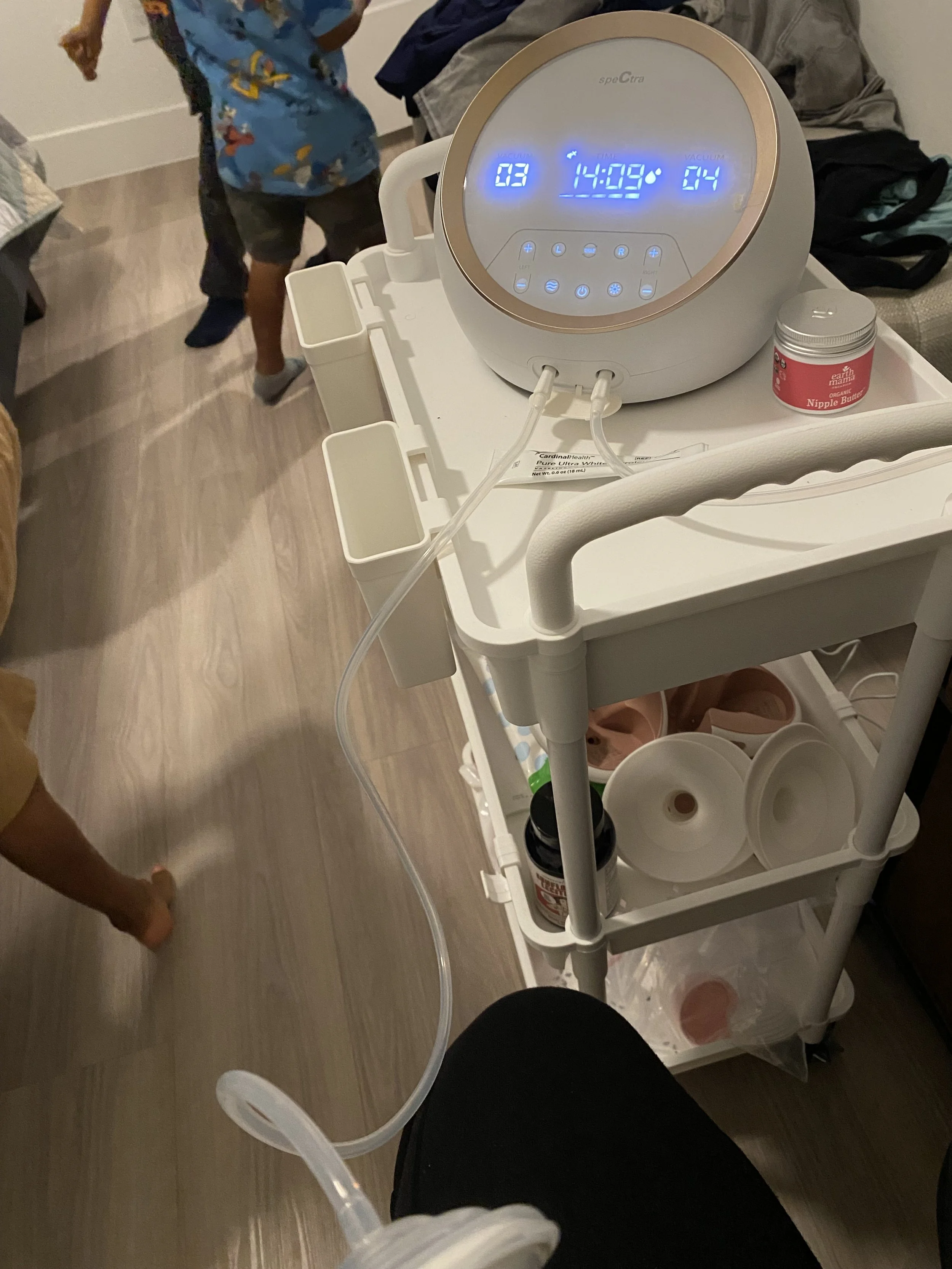 Wall pump, my kids running around. This postpartum I am not lonely while pumping but staying calm & relaxed adds to the challenge
